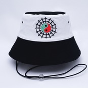 Dual colour bucket hat with neckband and original hand embroidered artwork.